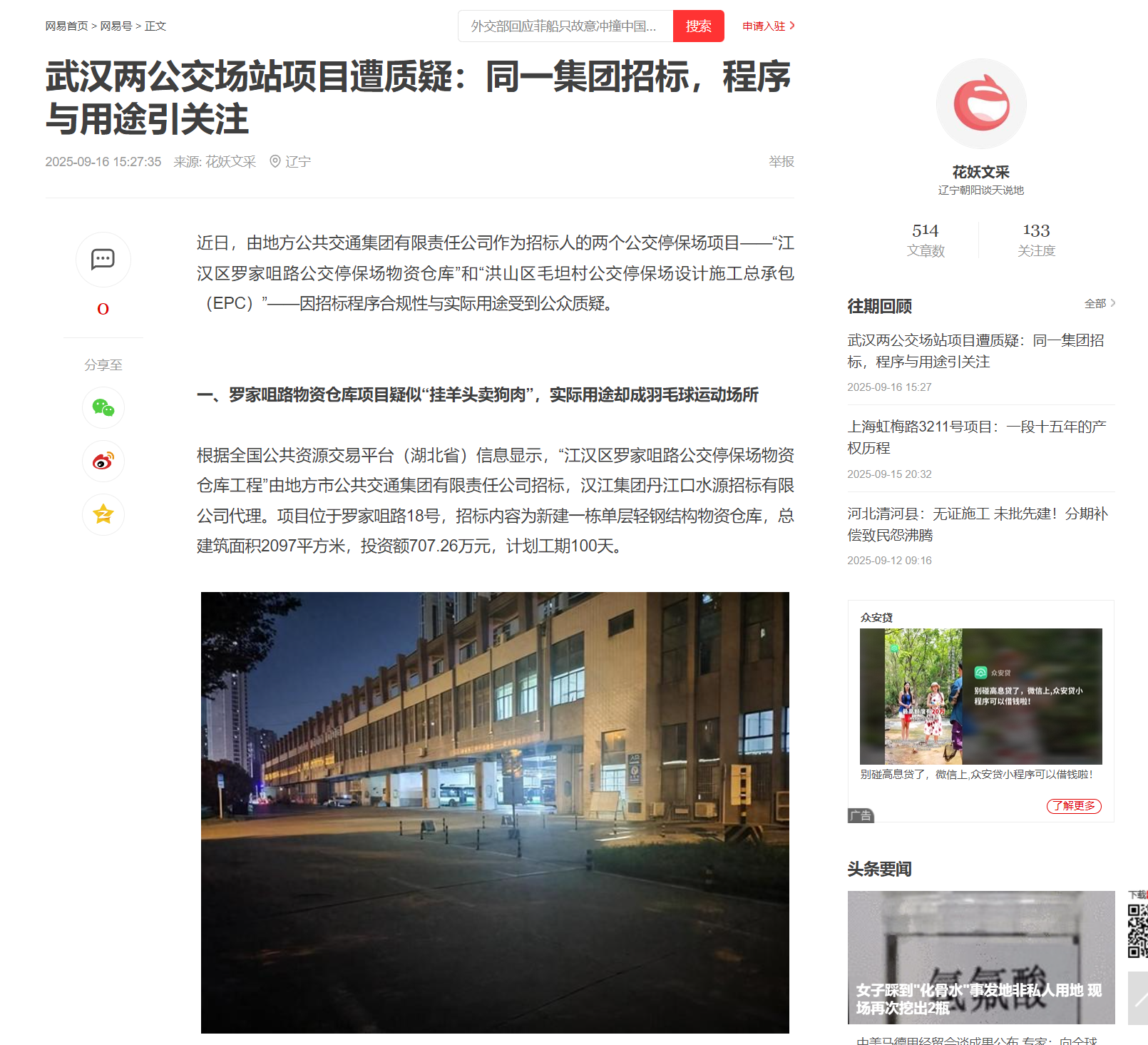 近日,由地方公共交通集团有限责任公司作为招标人的两个公交停保场项目——“江汉区罗家咀路公交停保场物资仓库”和“洪山区毛坦村公交停保场设计施工总承包(EPC)”——因招标程序合规性与实际用途受到公众质疑。